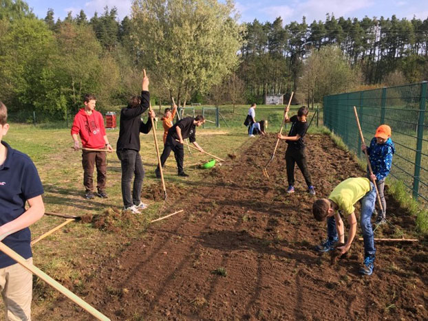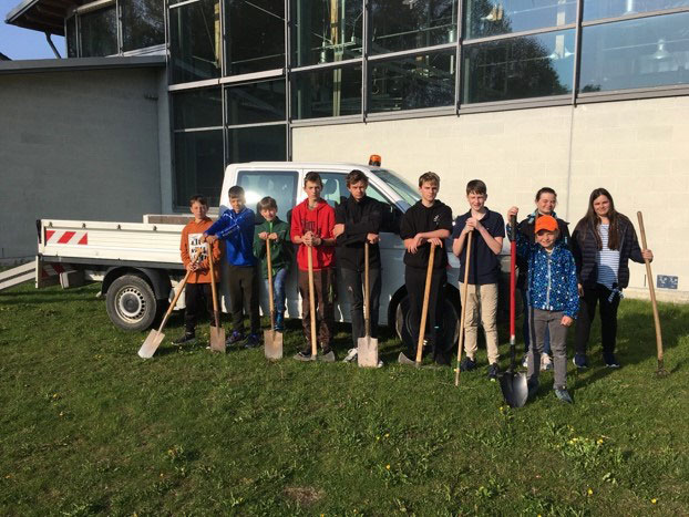 Zu Beginn wurde der harte Boden (ca. 50 qm) seitens des Bauhofes mittels einer Rasenfräse gelockert. Die Schüler haben anschließend die neue Kulturfläche mit Spaten, Schaufeln, Kreuzhacken und Rechen fertig vorbereitet. Nachdem das Saatgut ausgebracht wurde, musste der Boden angewalzt werden.