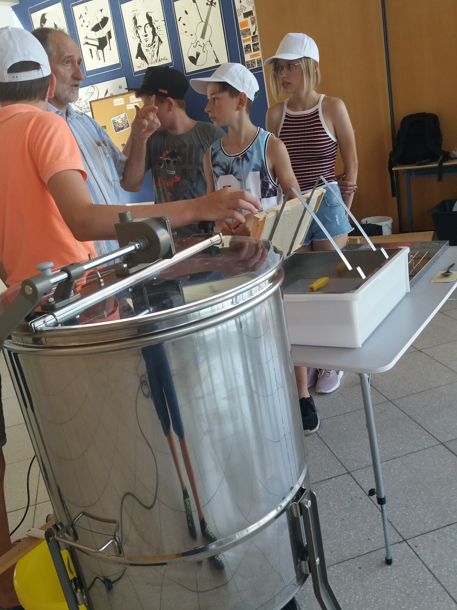 Am 26.06.19 war es dann soweit: unser erster Honig konnte geschleudert werden. Die Schüler unserer AG Bienen unter der Leitung von Herrn Lohr begannen bereits in der 1. Pause zusammen mit Herrn Pilarski, die Geräte für den Schleudervorgang aufzubauen: Entdeckelungsgeschirr und Honigschleuder wurden in der Aula vorbereitet. Der Schleudervorgang sollte im Schulgebäude stattfinden, denn das Schleudern im Freien birgt laut Herrn Pilarski zwei große Nachteile: Zum Einen droht mögliche Verschmutzung von oben (etwa durch Vogelkot oder Regen). Zum anderen sollte man zum Schleudern immer einen bienengeschützten Raum wählen. Wenn Bienen und Wespen den Honig riechen, kommen sie in Scharen, und das kann sehr unangenehm werden.