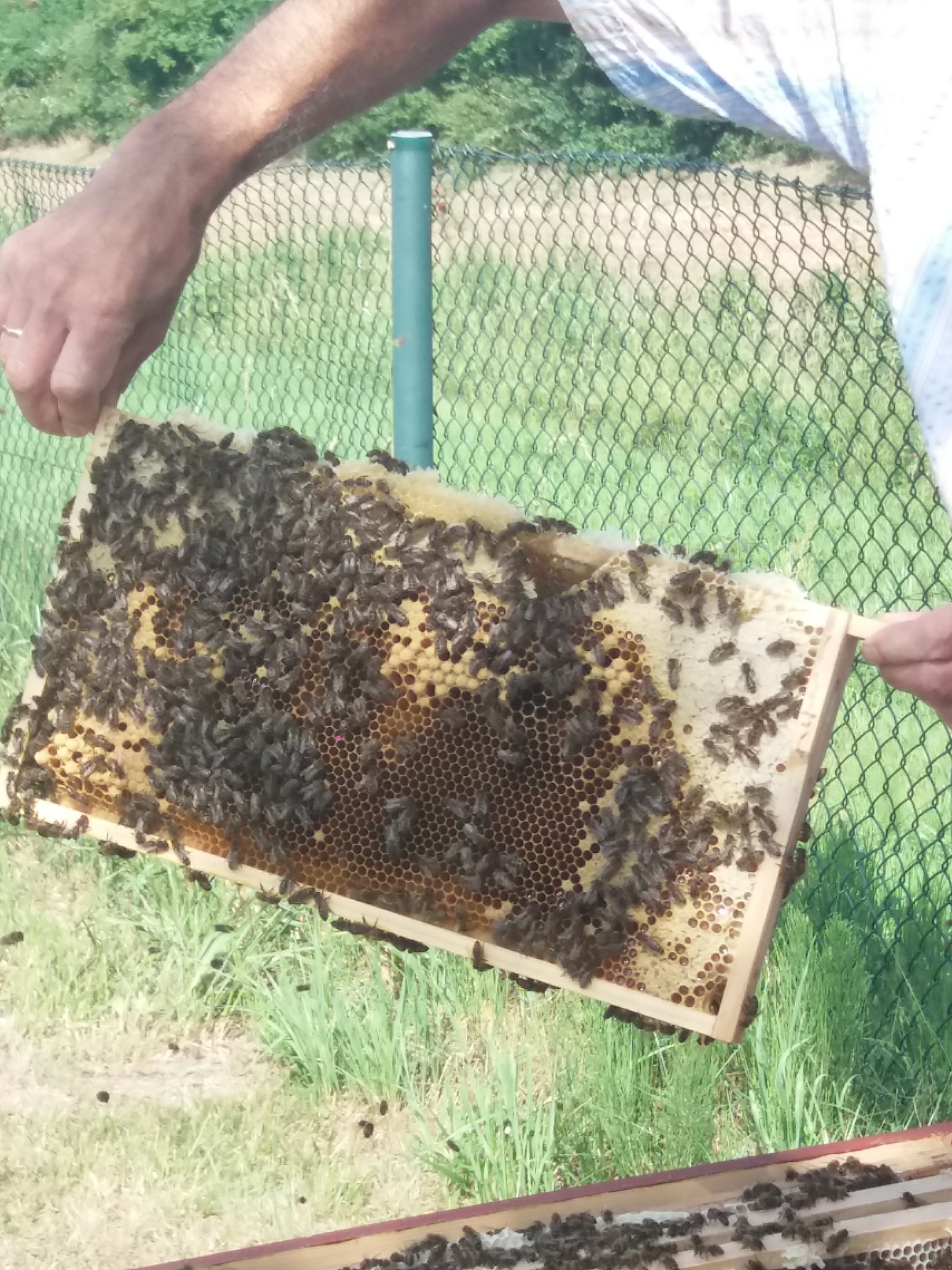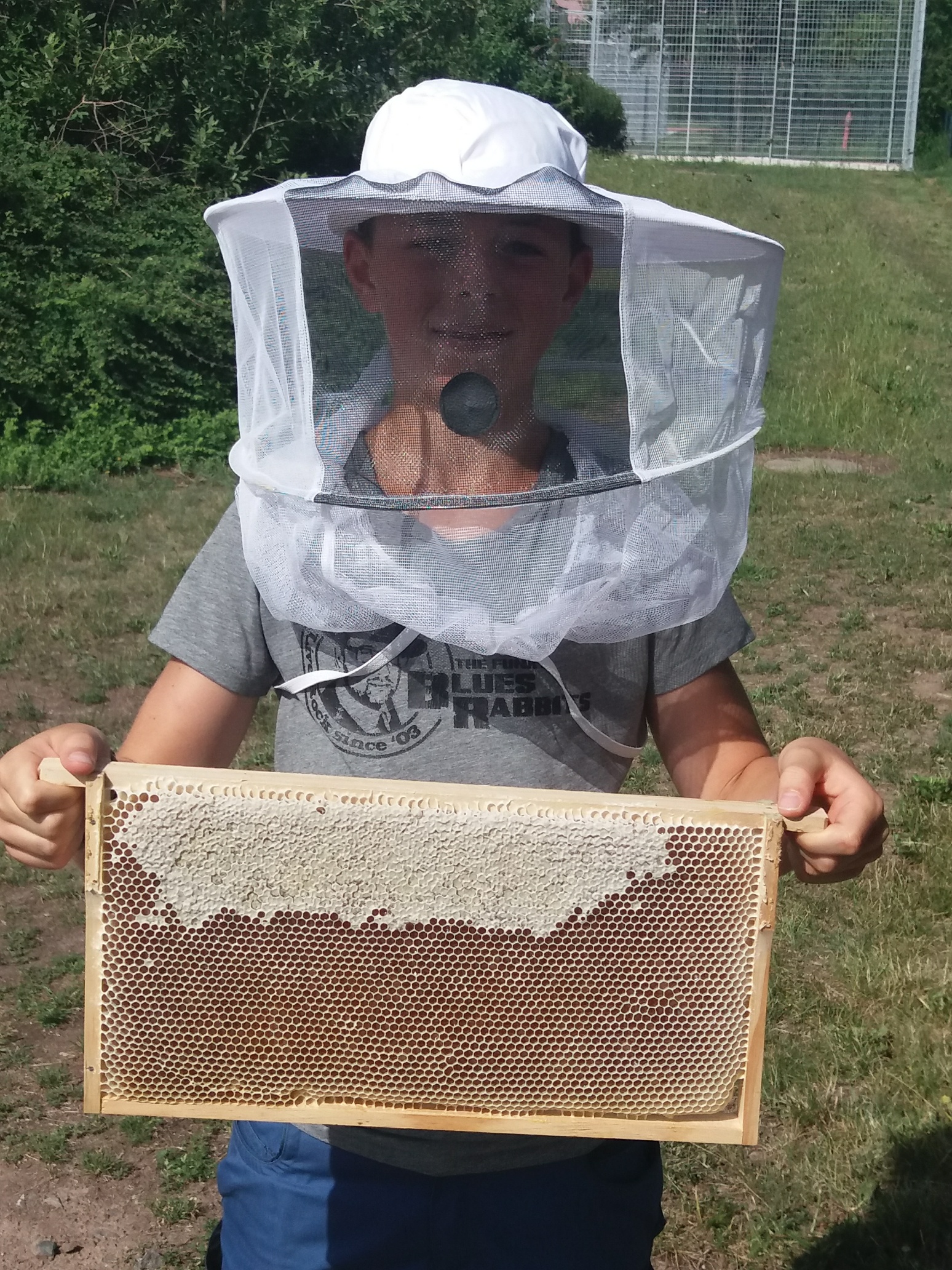 Am 26.06.19 war es dann soweit: unser erster Honig konnte geschleudert werden. Die Schüler unserer AG Bienen unter der Leitung von Herrn Lohr begannen bereits in der 1. Pause zusammen mit Herrn Pilarski, die Geräte für den Schleudervorgang aufzubauen: Entdeckelungsgeschirr und Honigschleuder wurden in der Aula vorbereitet. Der Schleudervorgang sollte im Schulgebäude stattfinden, denn das Schleudern im Freien birgt laut Herrn Pilarski zwei große Nachteile: Zum Einen droht mögliche Verschmutzung von oben (etwa durch Vogelkot oder Regen). Zum anderen sollte man zum Schleudern immer einen bienengeschützten Raum wählen. Wenn Bienen und Wespen den Honig riechen, kommen sie in Scharen, und das kann sehr unangenehm werden.